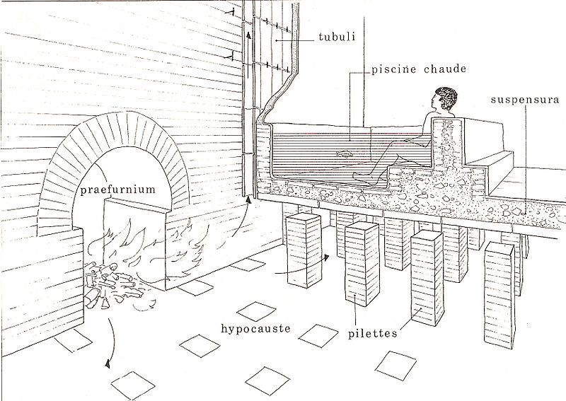 Mais, comment les Romains chauffaient cette salle ? Grâce aux système par hypocauste. Dans ce système, un four en sous-sol, le praefurium, chauffe l’air. L’air chaud se répand dans les murs. Ces derniers sont construits en brique afin de conserver la chaleur.